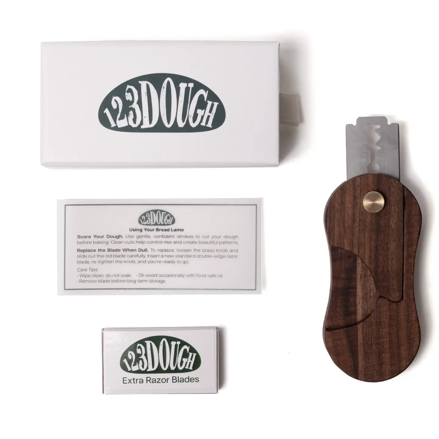 A perfect gift for sourdough lovers and home bakers. Includes: 1 Wooden Bread Lame 1 Box of 5 Extra Blades Care + Use Instructions Gift-Ready Box Care: Wipe clean only. Oil wood occasionally with food-safe oil. Do not soak.